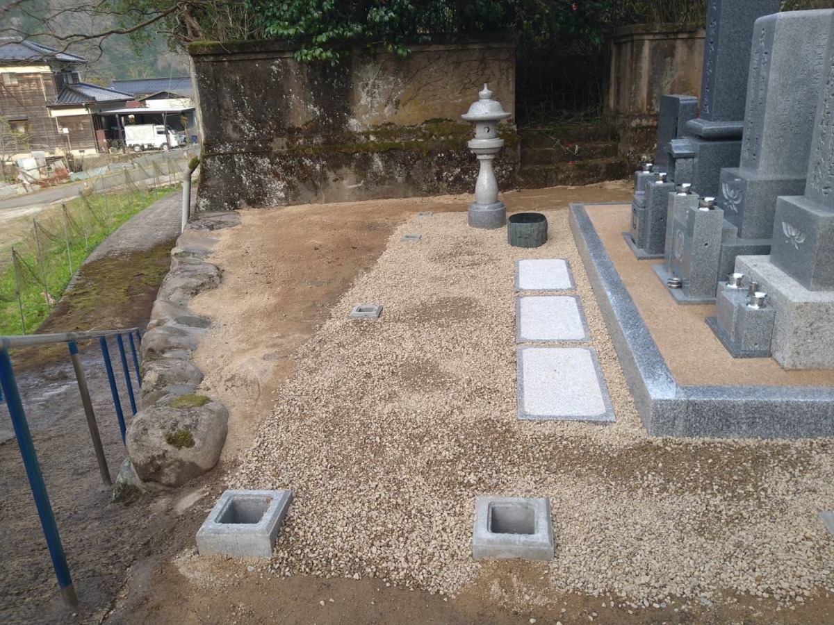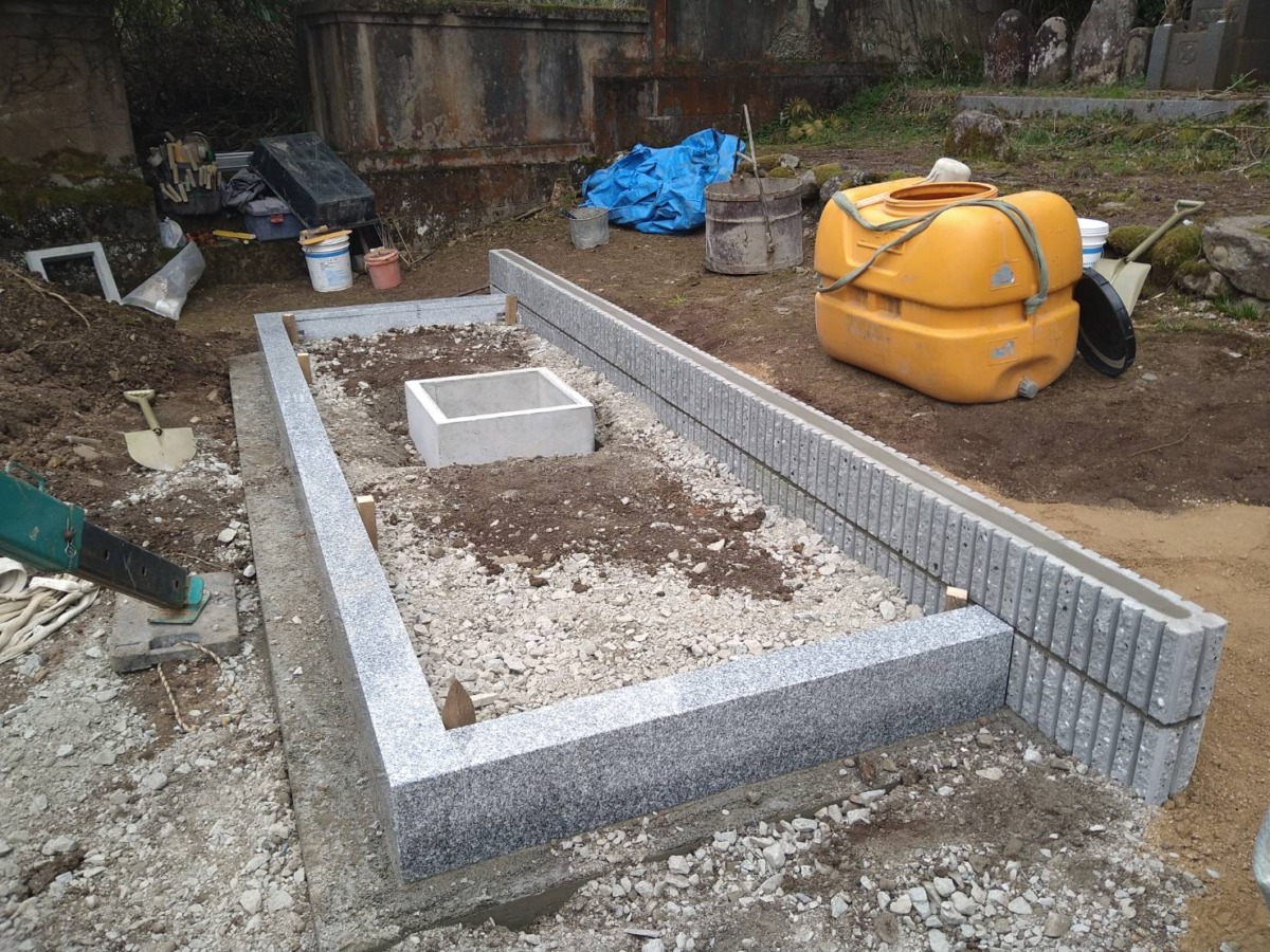 2026.01.28 養父市 H様 外国産御影石 尺寸二重台墓地が広いので、歴代碑2基と副碑も横並びに設置巻石内は防草土施工いたしました リブブロック積と巻石工事土を入れた納骨室石碑前には拝石を設置しています墓地への坂道に手すりを取り付けました仕上げに獣害対策のフェンスを設置供えたお花もこれで安心です 一覧へ戻る