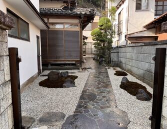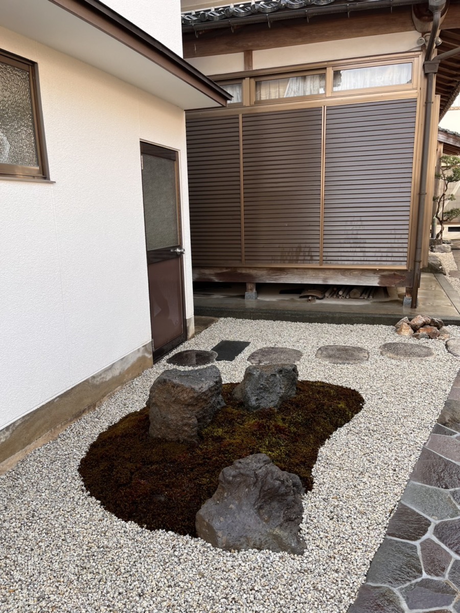 2026.01.28 養父市 O邸 玄関アプローチ工事通路には大判の鉄平石を施工していきます防草対策を施しながら、砂利を敷きならしました雨に濡れるとまた雰囲気が増します 鉄平石を配置を考えながら貼り付けていきます通路脇には植栽と置物既存の飛び石を配置こちらも既存のムシ石を移設 一覧へ戻る