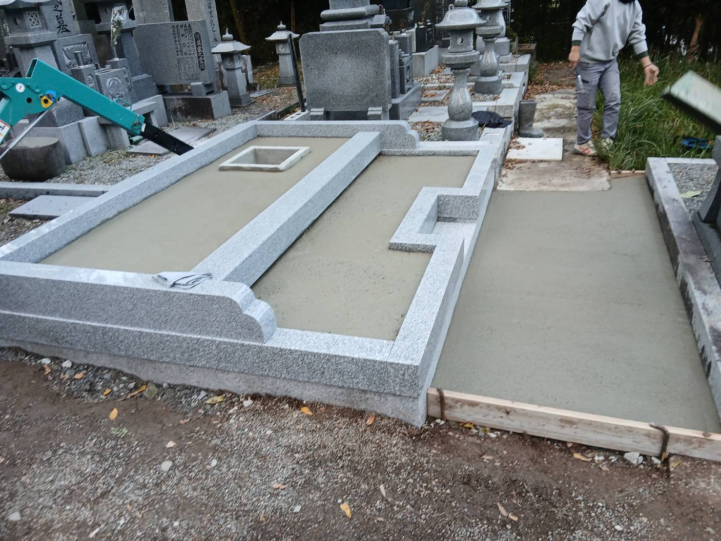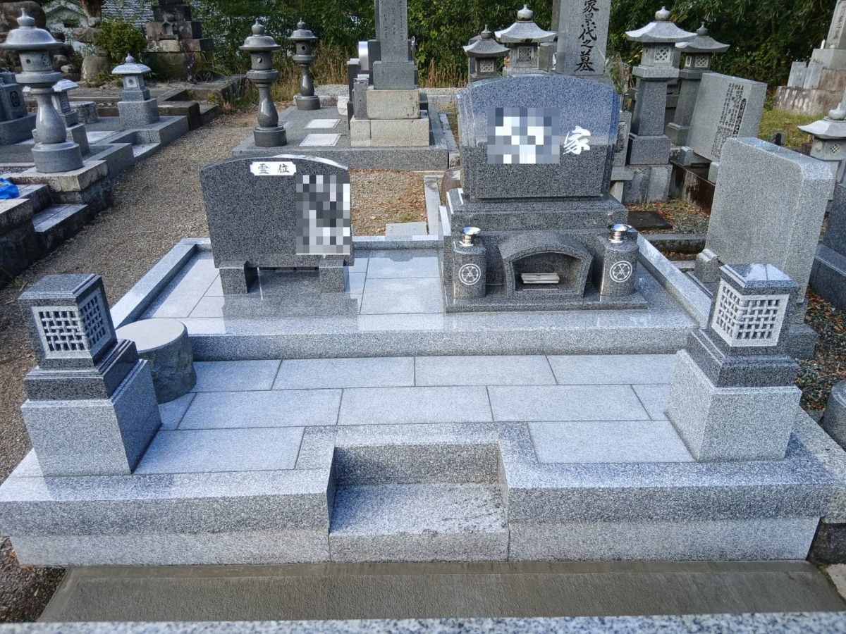 2026.04.04 豊岡市 H様 外国産グレー系御影石 デザイン墓 土留石・縁石・玉垣の据付、金具留めをしています石碑周りの上段および下段の土間は貼石施工で見た目も豪華です手前角にはデザイン型置き灯篭を据え全体をまとめています 墓地基礎工事ベースコンクリート打設土間貼石工事副碑裏に塔婆立据付 一覧へ戻る