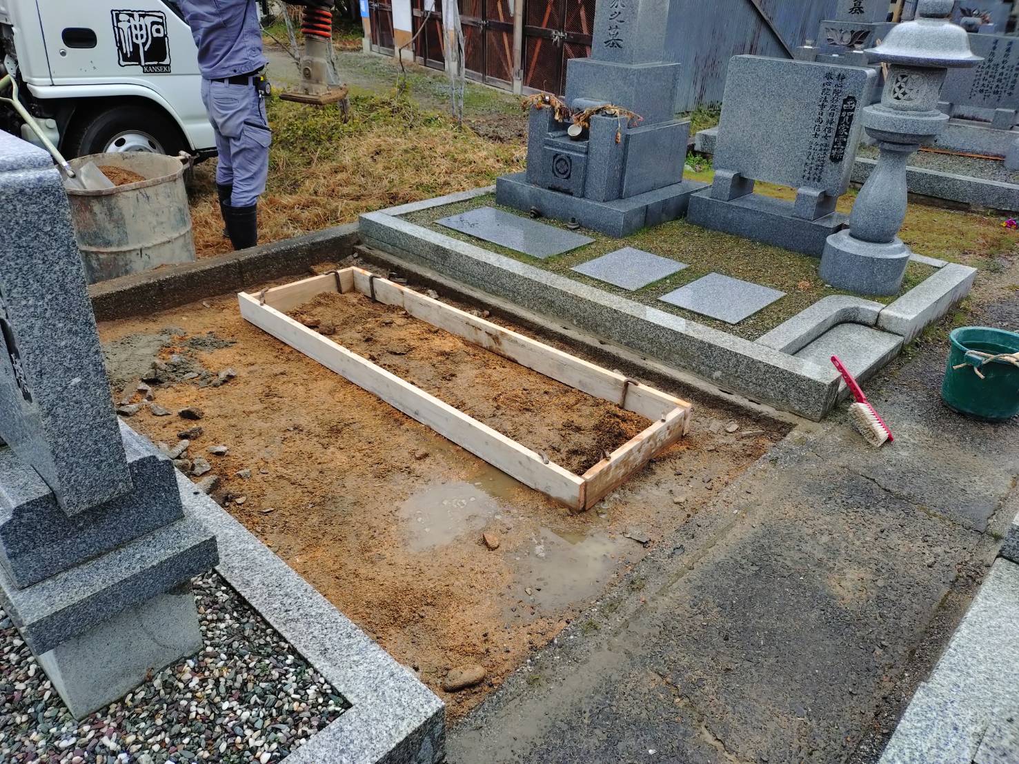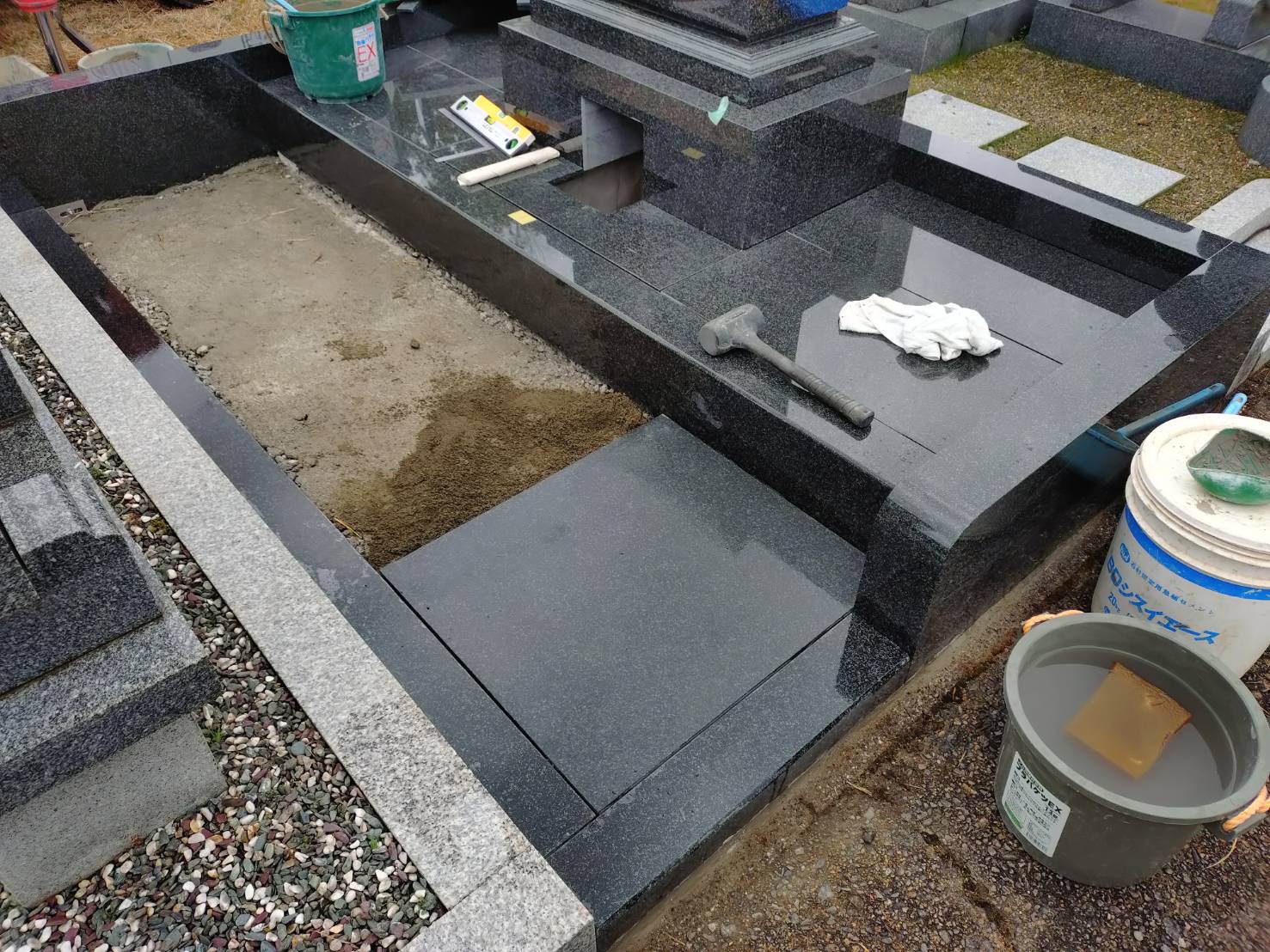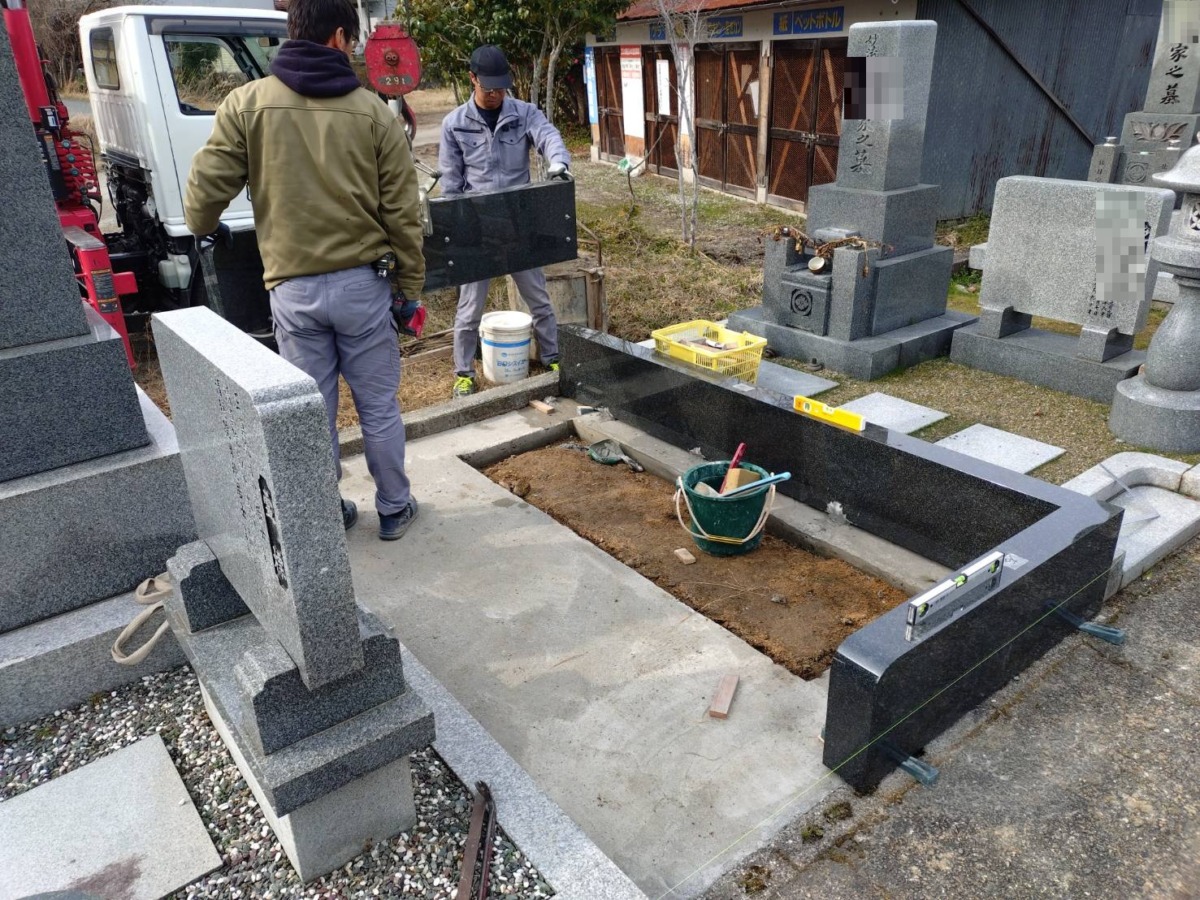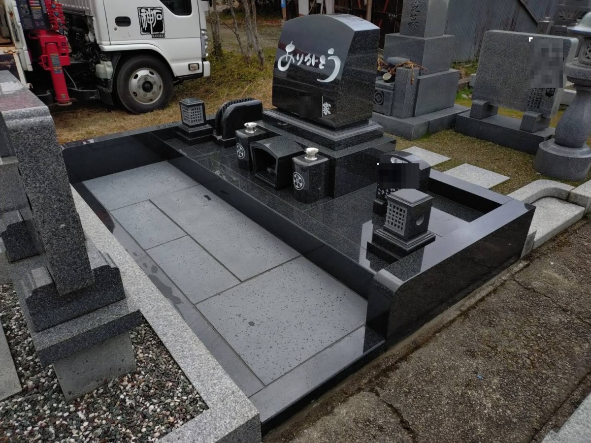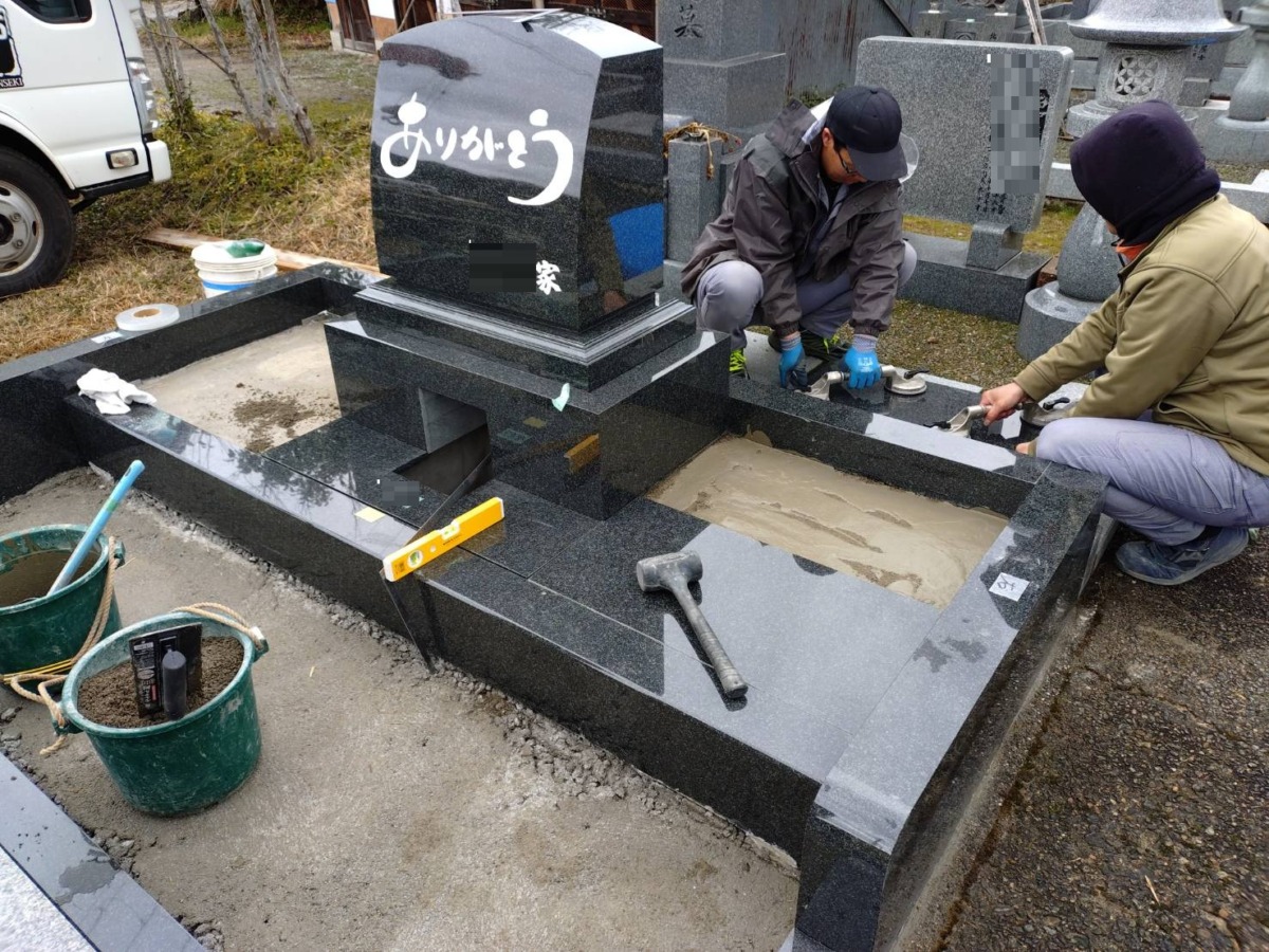 2026.03.28 豊岡市 I様 外国産御影石 デザイン墓 緑がかったグレー系の石種です石碑のすべてを同石種で揃えています足元は滑りにくい加工の貼石施工です竿石にはお孫様の想いの詰まった自筆の書が刻まれています記念に残る素敵なお墓です 基礎工事外柵据付石碑本体据付貼石工事完成 一覧へ戻る