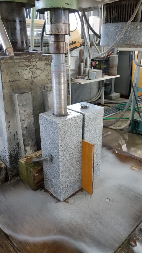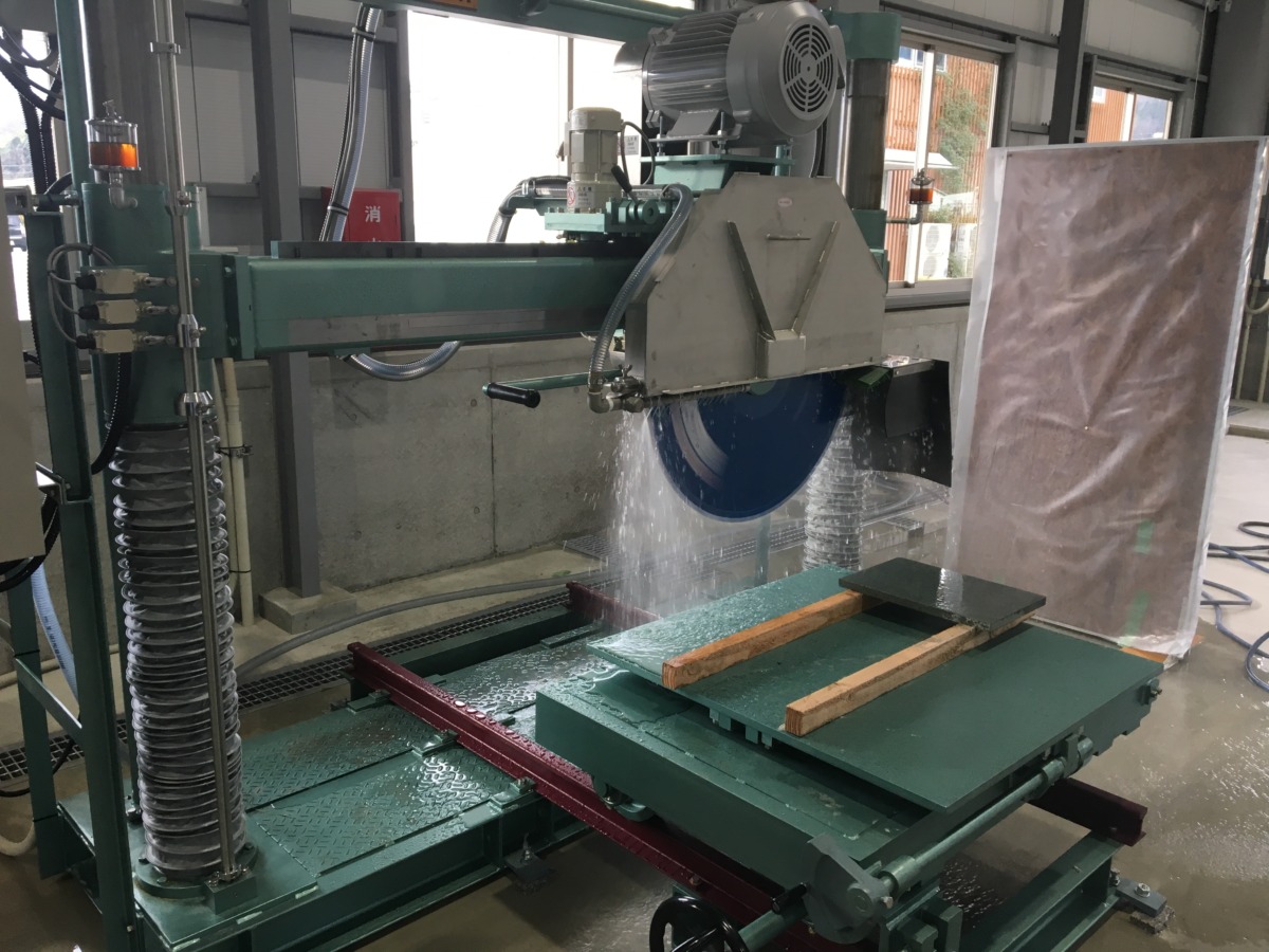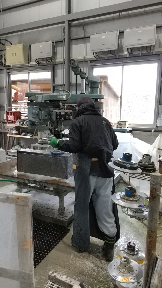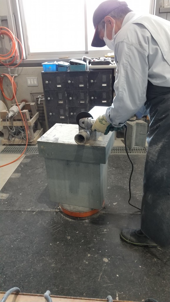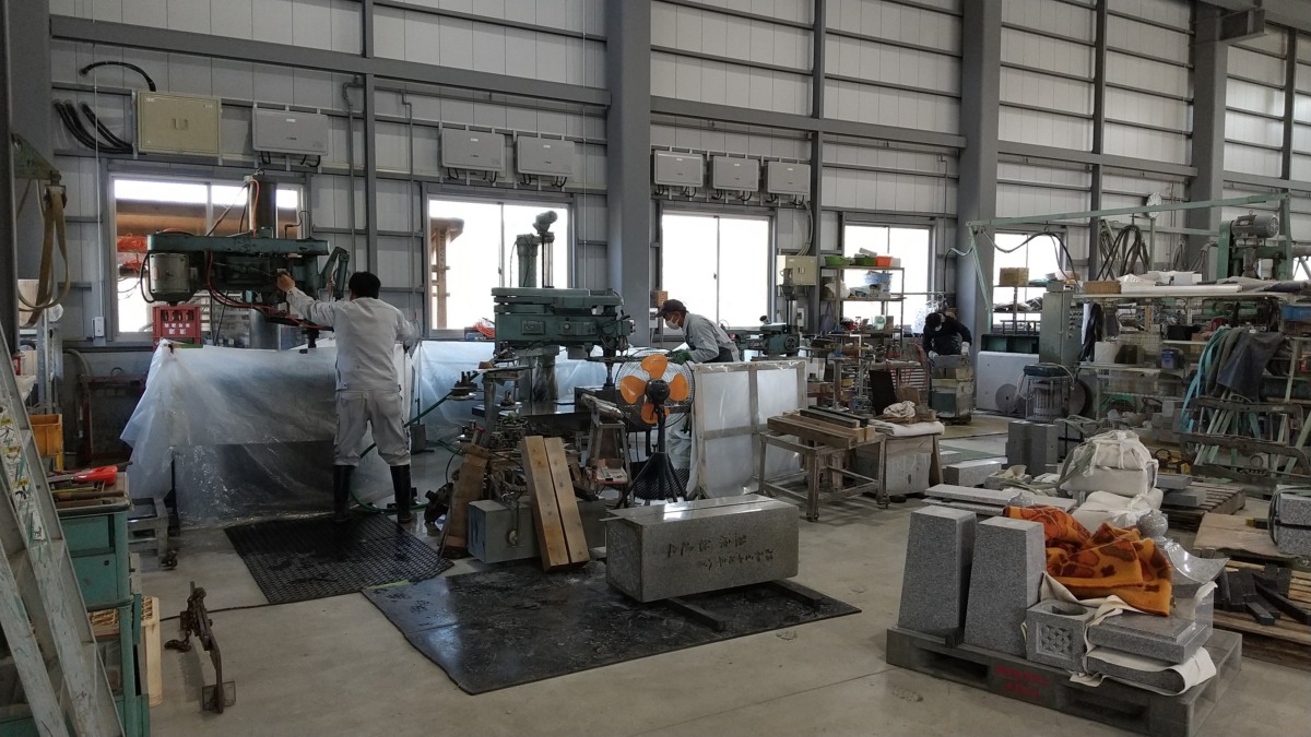 CATEGORY All 工場加工墓石事業 工場加工 工場加工 併設の工場にて、切断・切削・研磨・穴あけ作業等致します 各種研磨機を取り揃えています 研磨作業 自動研磨機 門型自動切断機 花立穴あけ直し加工 花立の中にステンレス花筒を入れるように加工しました。花の水替えも筒を抜くだけで簡単に出来ます。 鋳物製の花筒にヒビが入ったためステンレス製花筒に取替します 花立から花筒を切り離します 中に入れる花筒の大きさに穴を切削します 側面には水抜き穴をあけ溜まった水が抜けるようになっています 字彫加工 文字彫作業です。 この建物内の台車に石材を載せます 両側から照明を照らし、外側から腕を入れて作業します 彫り込む部分をくり抜いたゴムシートに勢いよく砂を吹き付けます 外側はこんな感じです。腕を入れる上に小窓があり、そこから確認しながら彫刻します