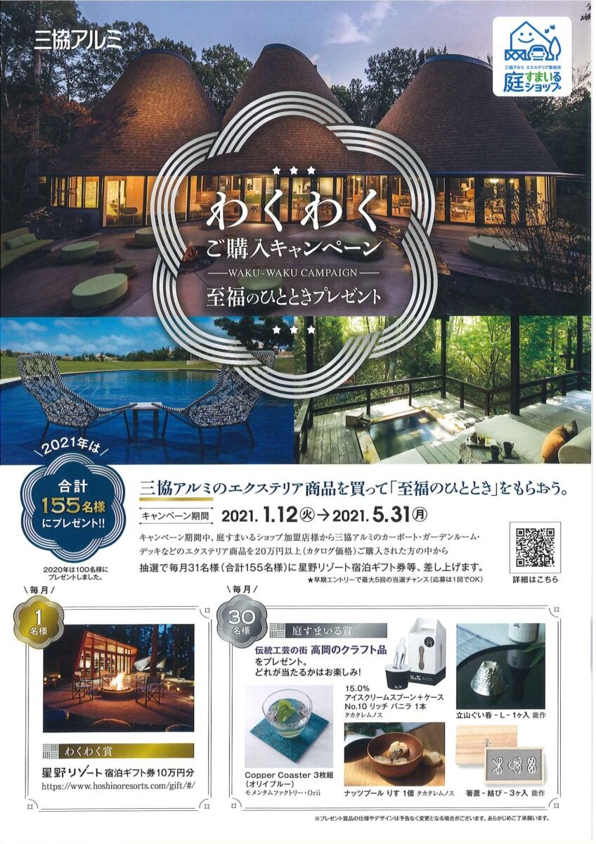 2021.02.02 エクステリア商品わくわくキャンペーン中 カーポート・デッキなどお考えのお客様へわくわくなお知らせです。弊社では、カーポート設置工事も行っております。カタログ価格20万円以上のご購入の方の中から抽選でプレゼントが当たります。是非、この機会にご検討下さい。