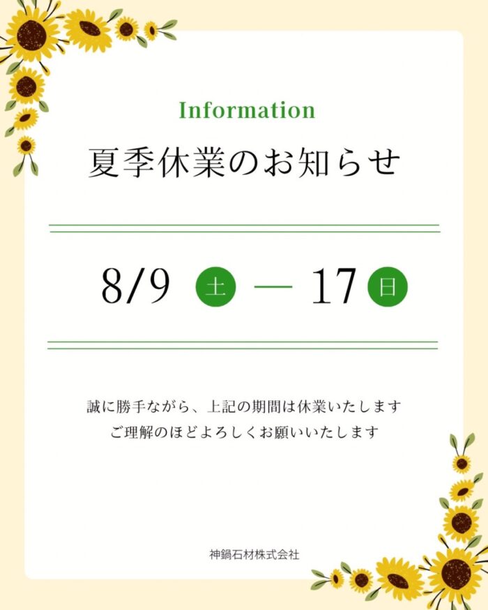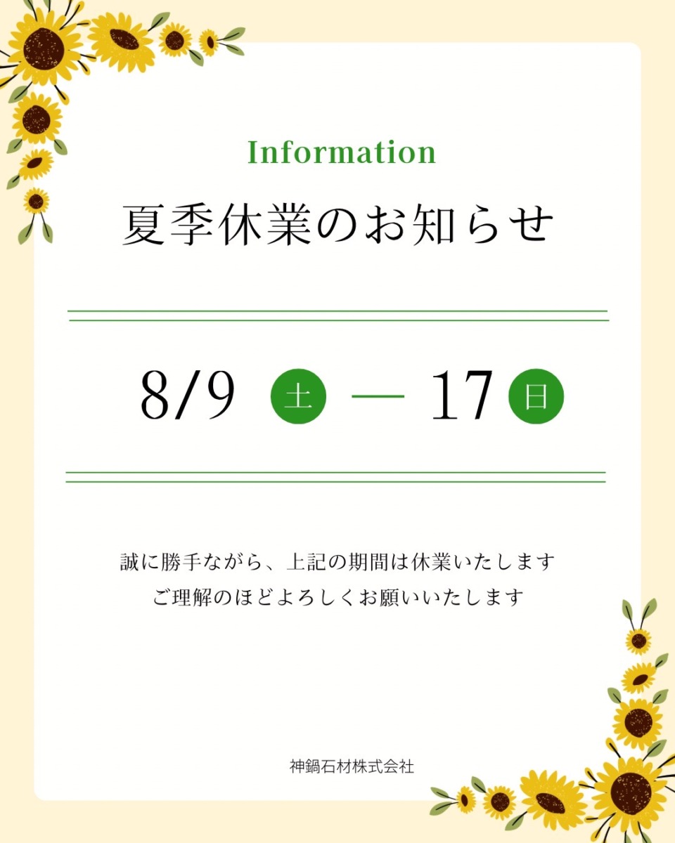2025.08.08 夏季休業のお知らせ 平素は格別のお引き立てをいただき、厚く御礼申し上げます夏季休業期間 8月9日~8月17日誠に勝手ながら上記期間はお休みさせていただきます。ご不便ご迷惑をお掛けしますが、ご理解の程よろしくお願いいたします。なお、8月18日より通常営業いたします。