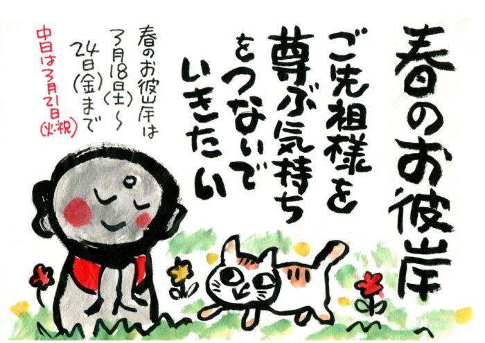 2023.03.17 春のお彼岸 今年は3/18(土)~3/24(金)までの1週間となります。 ご先祖様に感謝の気持ちを込め、お参りに足をお運びください。 なお、お供え物は動物に荒らされる恐れもありますので持帰るように致しましょう。
