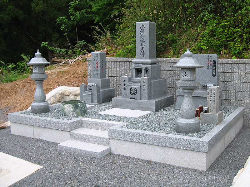 2009.03.06 施工例10 曹洞宗のお墓です。写真のお墓は竿石に「南無釈迦牟尼佛」と刻んでいますが、曹洞宗の方は「何々家之墓」と彫られる形が多いです。山裾を削り、敷地を整地し、背面にリブブロックを積み土留めをしています。中央に代々碑、右隣に夫婦墓、左隣に副碑を据えています。 一覧へ戻る
