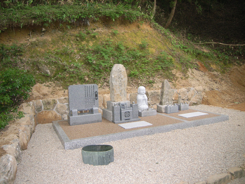 2012.06.22 施工例21 お客様の要望で特別に大きい地蔵尊を作りました。先祖代々のお墓は、既設のものを洗浄し、納骨できるよう、骨穴を加工し、新しい供物台と花立を取り付けました。巻き石内は防草土に代わり、固まるサビ砂利を敷き詰めています。防草土に比べ、費用はかさみますが、水はけがよく、丈夫です。管理のしやすいお墓になりました。 一覧へ戻る