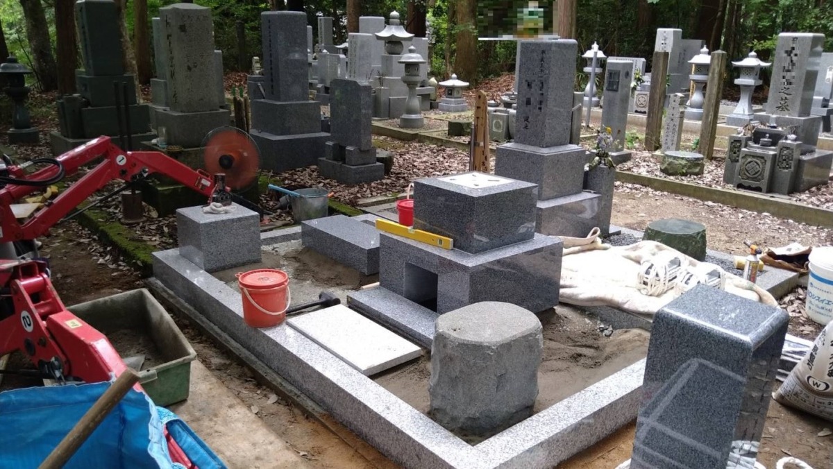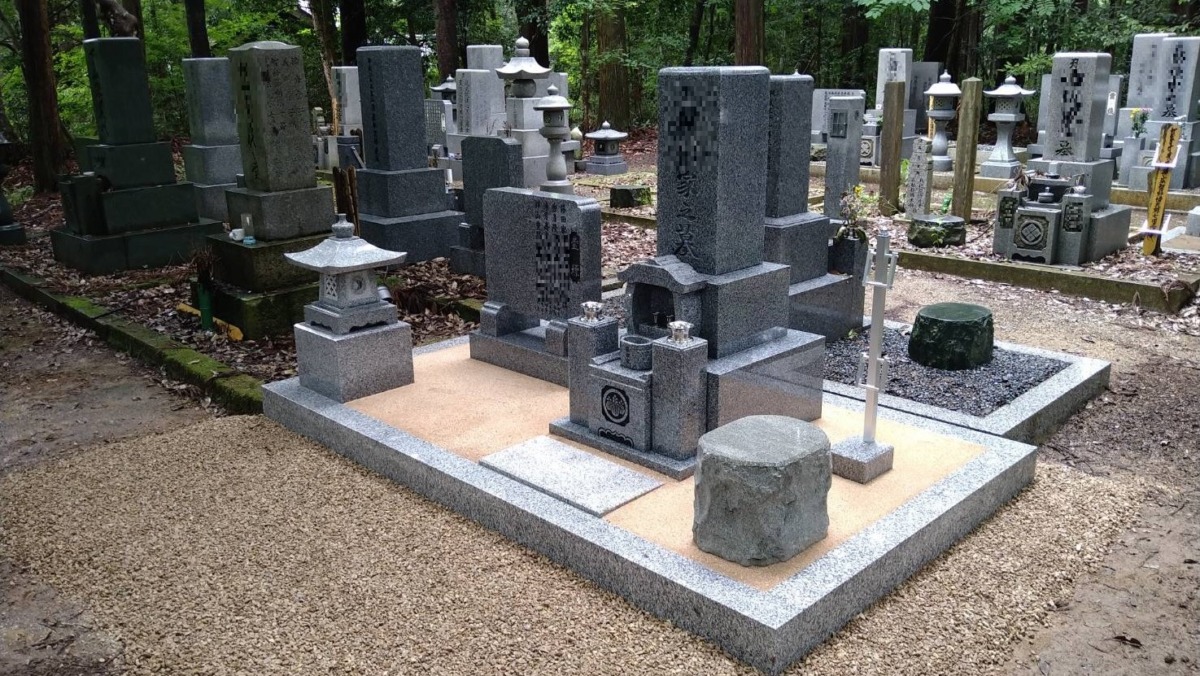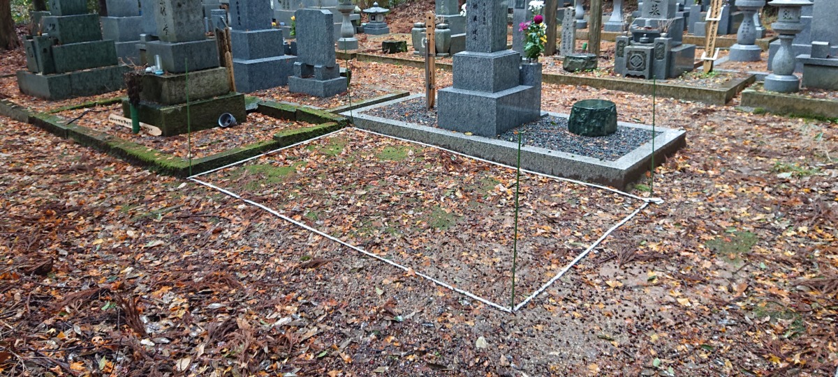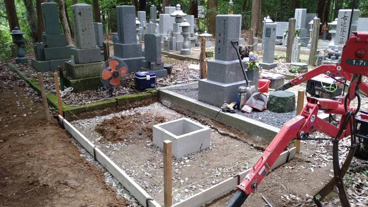 2024.07.02 豊岡市 F様 最近人気の高いグレー系御影石の9寸2重台左端に置型灯篭、右側に物置台を配置していますまた、巻石内は草の生えにくい防草施工となっています お寺の墓地区画への据え付けです基礎工事置型灯篭の台石・物置台も設置します 一覧へ戻る