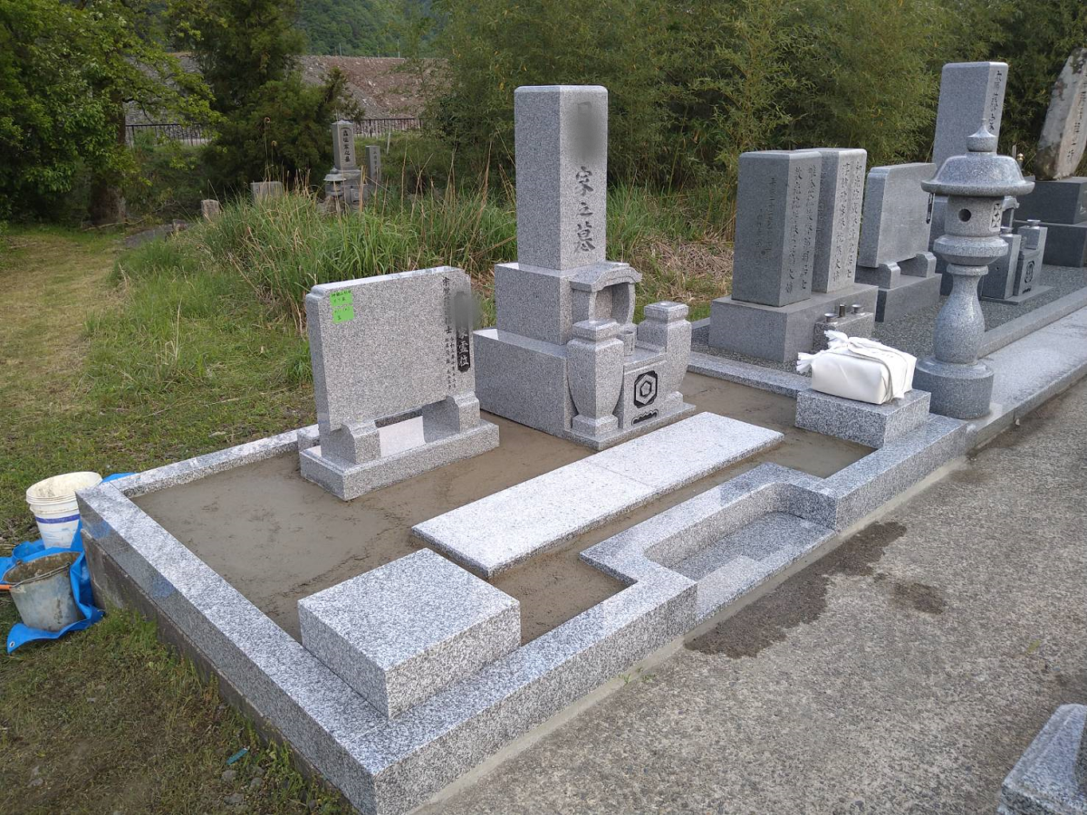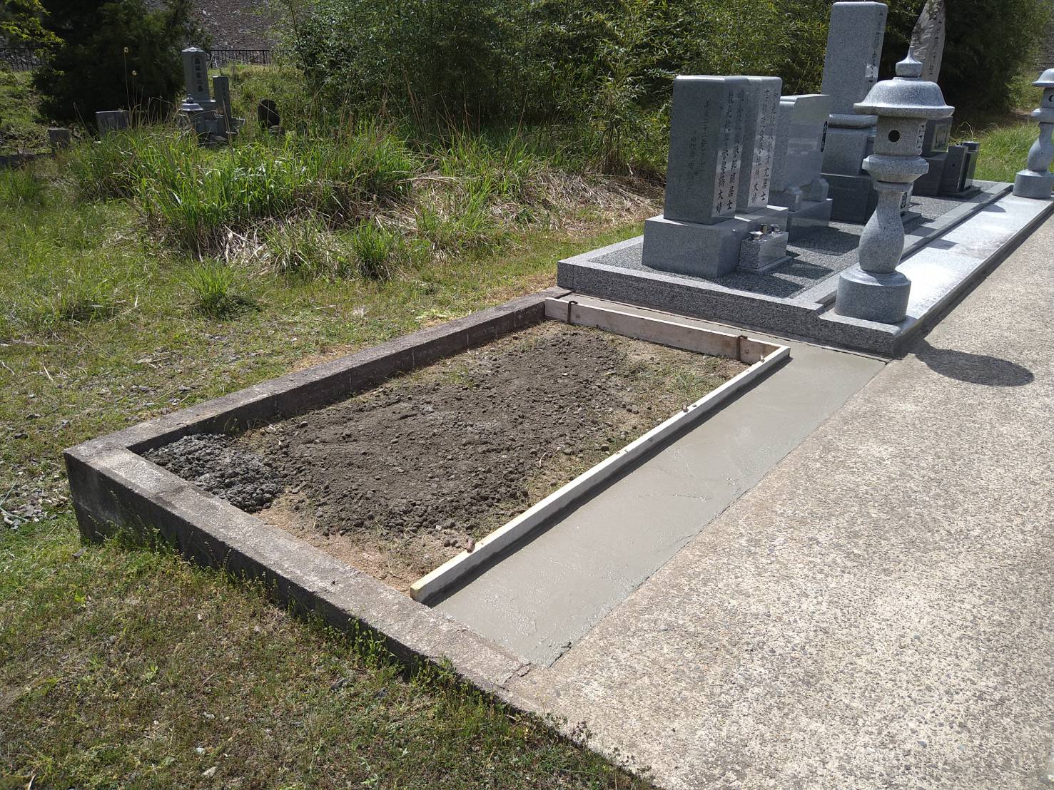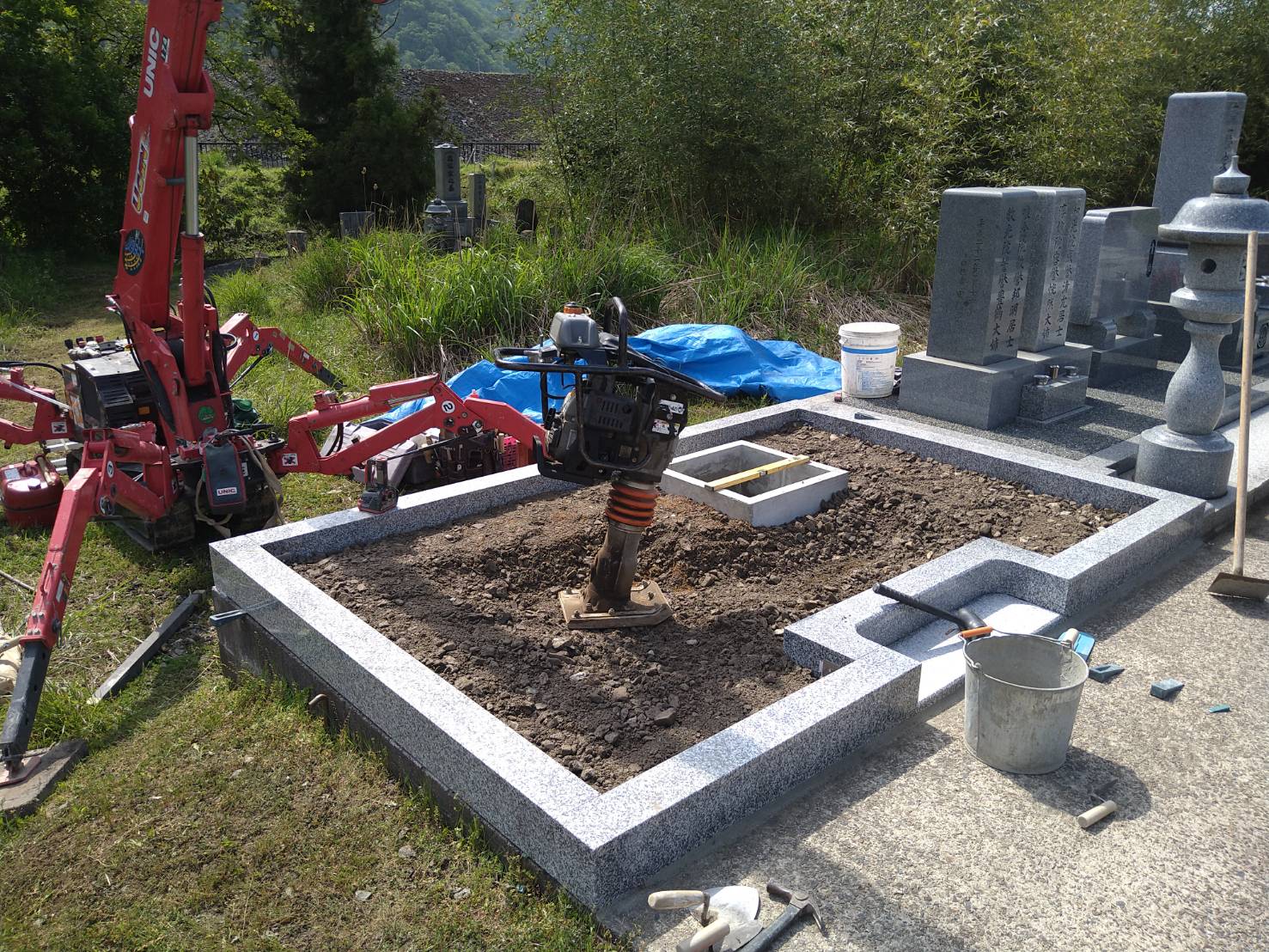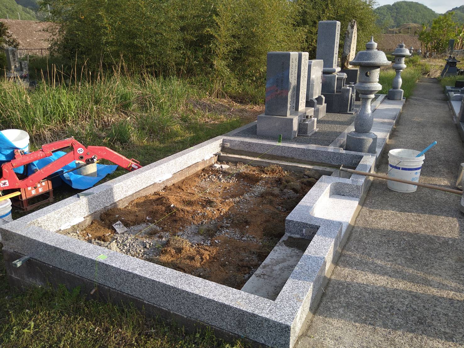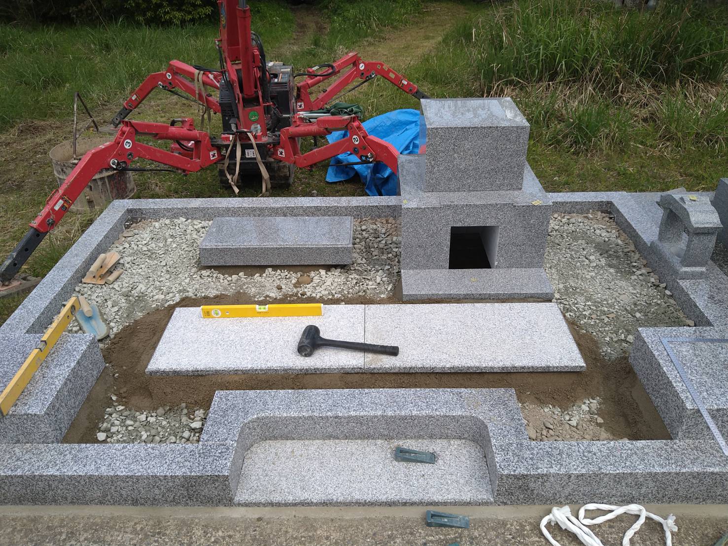 2021.06.15 豊岡市 K様 和型墓石9寸二重台の白御影石・副碑・ステンレス塔婆立・置き灯篭の据付工事です。石碑前に大き目の拝石が据え付けてありますので、お参りしやすくなっています。 施工前の墓地です巻石を据え付けて周りを囲みました巻石内に納骨室を設置し、そこ以外は砕石を入れて転圧します大き目の拝石2枚を手前に敷き、石碑・副碑を据え付けますこの後角置き灯篭を据え、副碑裏にステンレス塔婆立を建て、那智黒石を敷き均します 一覧へ戻る