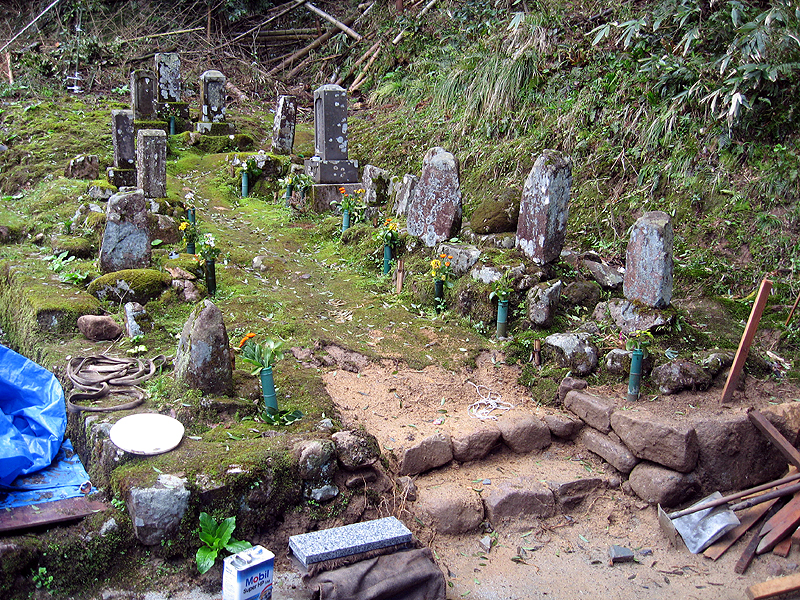 前方には間知石を積み、山裾には土留めのブロックを新設し、墓地全体を延石で囲みました。