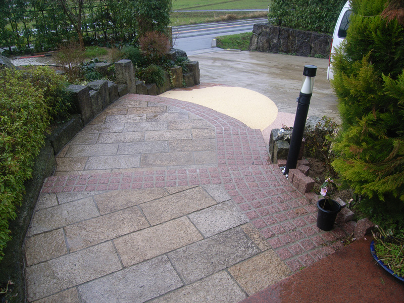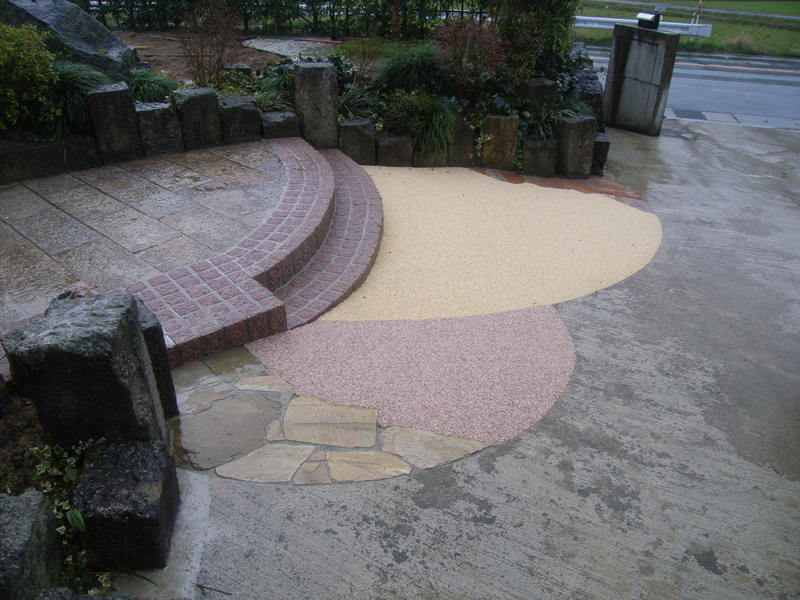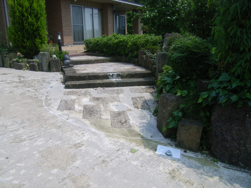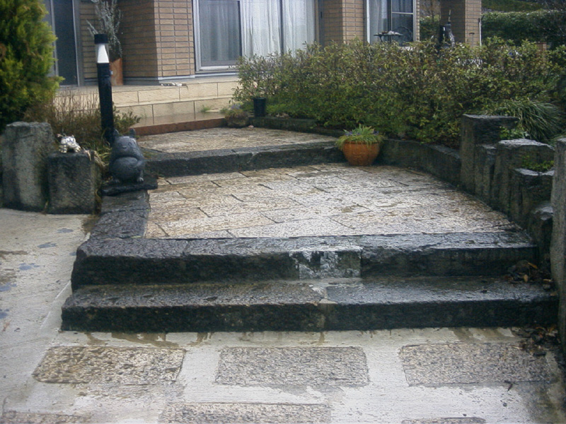 2012.07.12 施工例14 施工前:既設の階段石が欠けるので、リフォームしたいとのご依頼。施工前:コンクリート土間にドライカッターでアールを描き、仕上げは樹脂の洗い出しにします。施工後:既設の階段石を取除き、ピンク色のピンコロ石で段鼻を作りました。 施工後:手間がかかりますが、1つ1つ測ってアール型に据えました。施主様に大変満足して頂けました。 一覧へ戻る