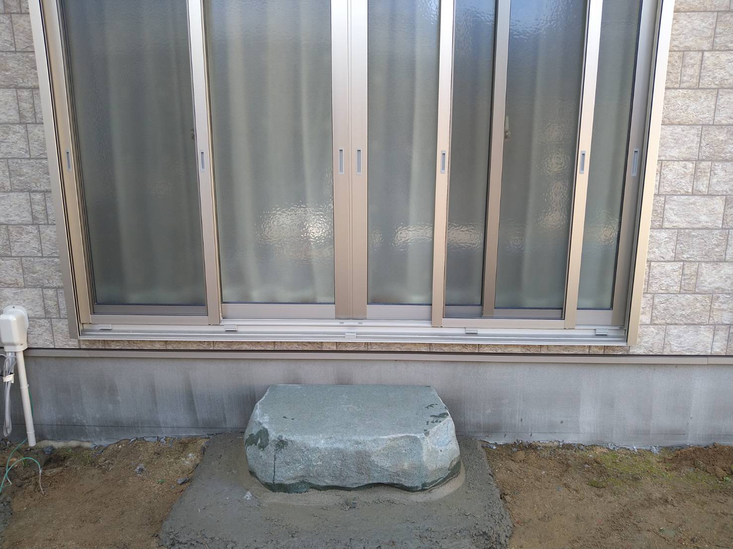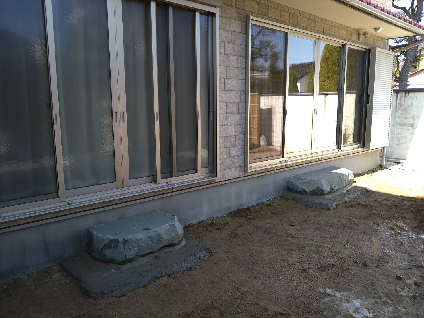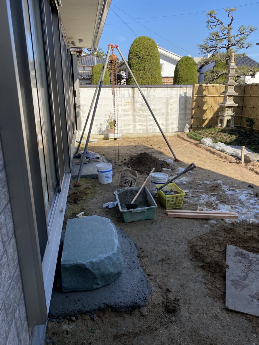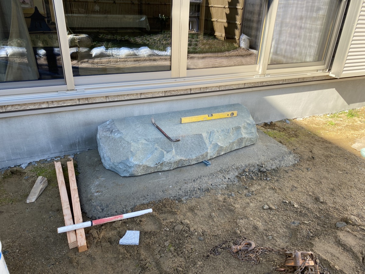 2021.03.14 豊岡市 I様邸 神鍋産の沓脱石を2つ据付いたしました。グレーのかかった独特な緑色をしていますが雨に濡れるとより深い緑色に変わります。 奥の庭まで養生をして運搬機で運びましたカートクレーン等の機械が入らない為、チェーンブロックを使用し据え付けていますこちらは横幅1500㎜ 奥行550㎜こちらは横幅850㎜ 奥行500㎜ 一覧へ戻る