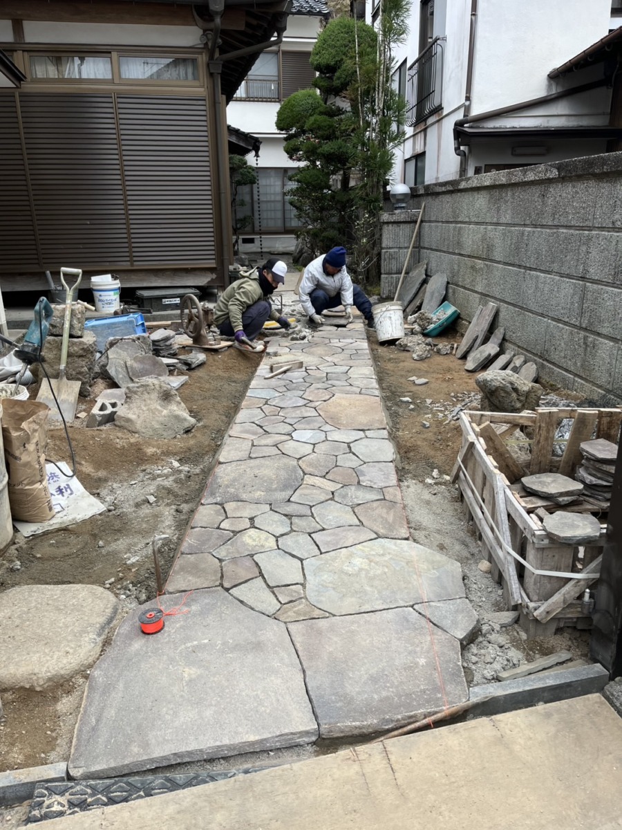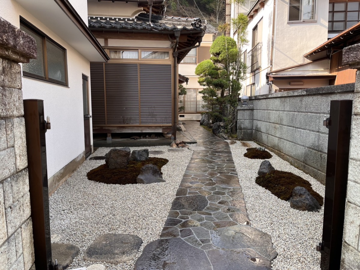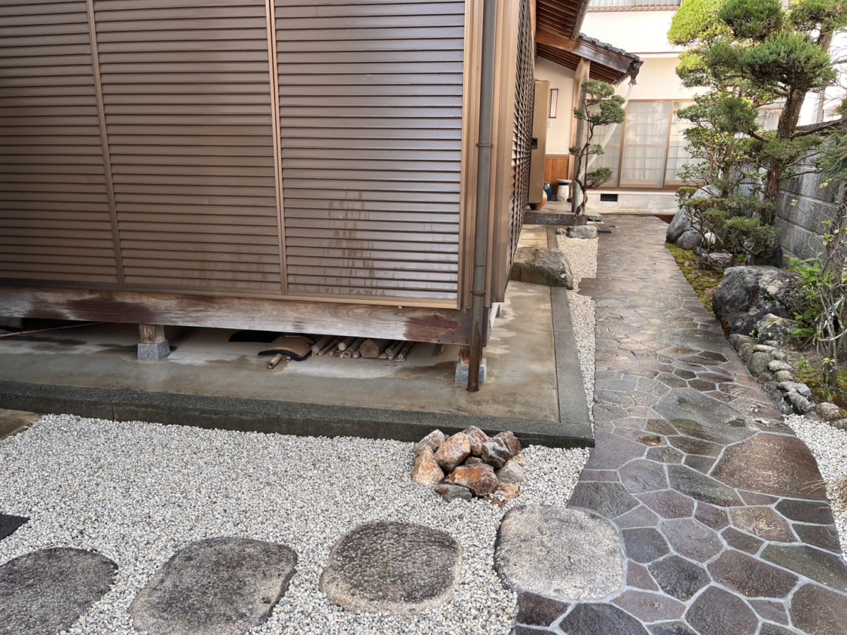 2026.01.28 養父市 O邸 玄関アプローチ工事通路には大判の鉄平石を施工していきます防草対策を施しながら、砂利を敷きならしました雨に濡れるとまた雰囲気が増します 鉄平石を配置を考えながら貼り付けていきます通路脇には植栽と置物既存の飛び石を配置こちらも既存のムシ石を移設 一覧へ戻る