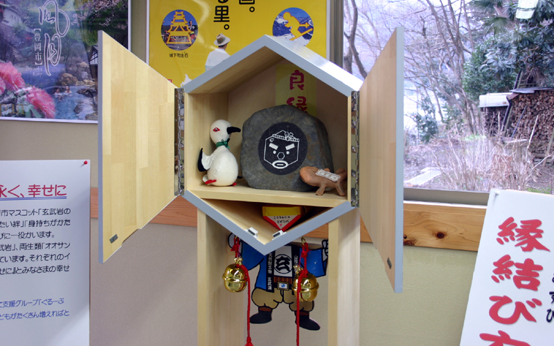 2010.02.23 縁結びの玄さん 弊社制作の玄武岩の「縁結びの玄さん」が、国の天然記念物に指定されている玄武洞公園内の無料休憩所の中に設置されています。 豊岡市の「ごつキャラ 玄さん」にあやかって、「玄さんの縁結び事業」の一環で設置した木製の記念オブジェの中にぬいぐるみのコウノトリと土鈴のオオサンショウウオといっしょうに玄さんの顔を彫った玄武岩が置かれています。 縁結びのお願いの仕方?も紹介されています。是非、一度訪れてみてください。良い縁がありますように・・・。 一覧へ戻る