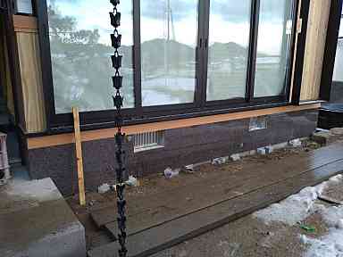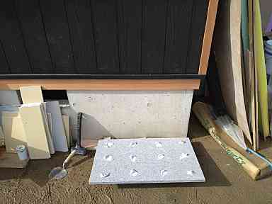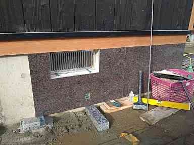 2021.03.27 与謝野町 S様邸② 住宅基礎立上り部分の貼石工事です。こちらはダコタマホガニーというアメリカ産の板石が貼り付けてあります。磨いてある赤茶系の石で鮮やかな印象です。 こちらが施工前の基礎立上り部分です。コンクリート部分にボンドで板石を接着します。換気口に合わせてカットした大判の石もピッタリ貼り付けてあります。 一覧へ戻る