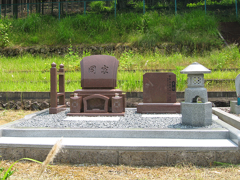 2009.03.05 施工例01 養父市市営墓地に立てた洋型の石碑です。ご年配のお客様ですが、モダンな洋型を強く希望され、扇形でデザインしました。ワインレッドの鮮やかな色合いで、たくさん石碑が並んでる中でも一際目立ちます。 一覧へ戻る