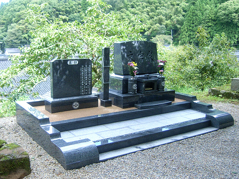 2009.03.05 施工例02 洋型のお墓の形に合わせて外柵の囲いもモダンな形を心がけました。入口は滑らないよう表面がザラザラのバーナー加工の板石を貼り付け、石碑周りは防草土といって固まる土を敷設しました。これで墓地の区画内は草は生えません。遠方で、なかなかお墓の管理が出来ない方にもお勧めです。 一覧へ戻る
