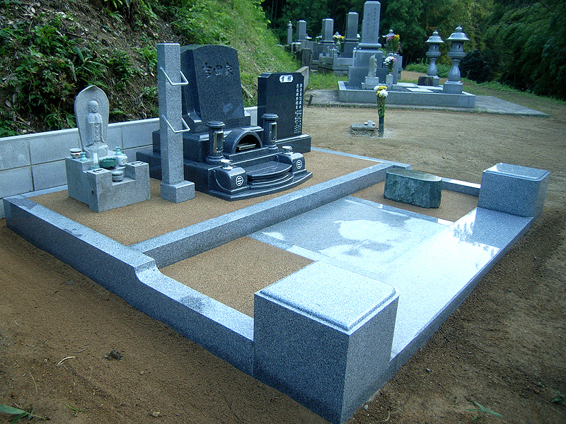 2009.03.05 施工例03 シンプルで落ち着いたデザインの洋型石碑の完成です。既設の地蔵尊を据え直し、石碑と副碑は同じグレー色の石種、外柵は白の御影石で仕上げました。後は土留めとしてブロックを積み上げ、敷地内は防草土を敷設し、崩れた土や雑草がお墓の敷地内に入り込むのを防いでいます。灯篭の代わりにローソク立てを置きました。 一覧へ戻る