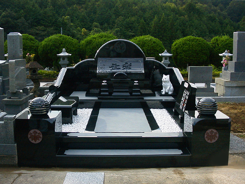 2009.03.05 施工例04 形とデザインにこだわり、石碑、外柵と同じインド産黒御影石を使い、迫力のある洋墓を建立しました。黒の御影石に白砂利がに映えます。家紋は赤い御影石に彫刻し、親柱にはめ込みました。大理石で作ったリアルな白猫が、守り神のように門番しています。 一覧へ戻る
