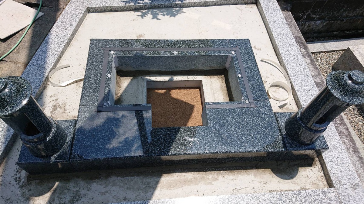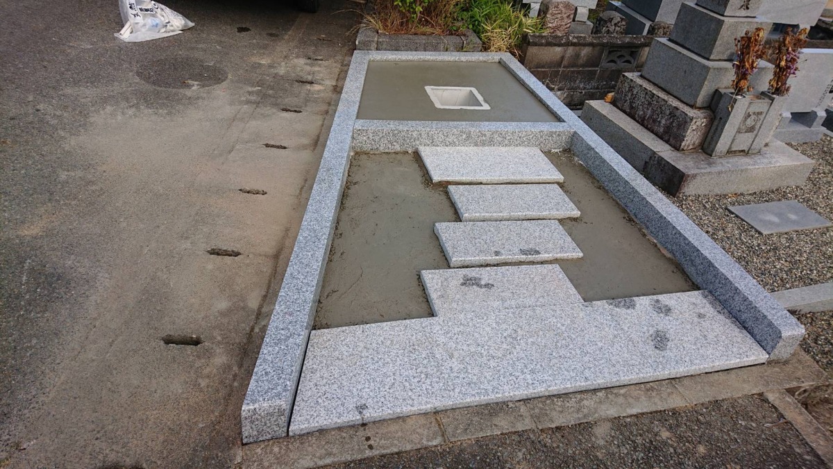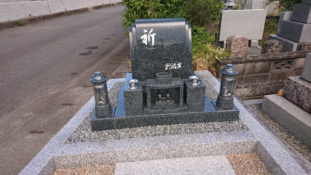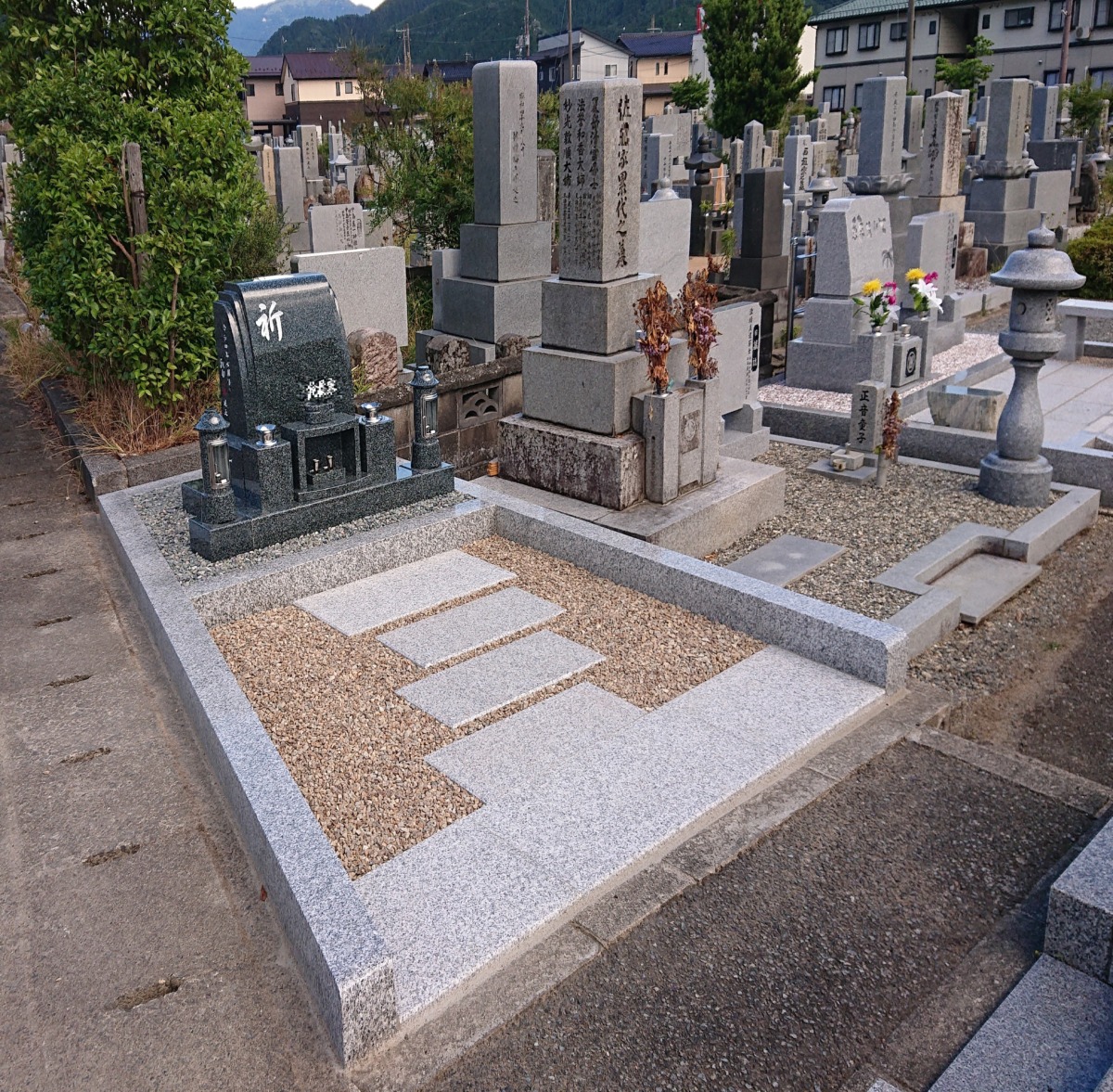 2024.02.01 朝来市 N様 洋型墓石建立工事 外国産 グレー系御影石同石種の防風塔(ローソク立)もセットになっています 共同墓地の一画への建立ですいびつな墓地ですが区画に合わせて延石を据え付けます納骨室を設置し、四ツ石を据え付けます滑り止めにバーナー仕上げを施した拝石を並べ、明るい色の砂利を敷き均しました 一覧へ戻る