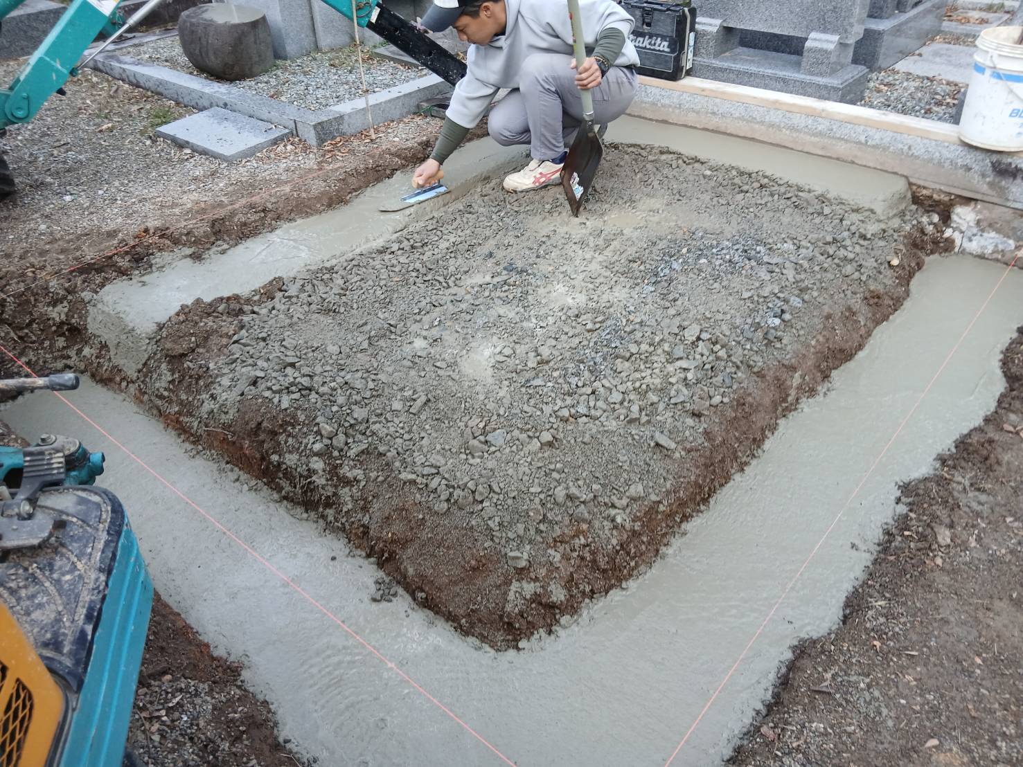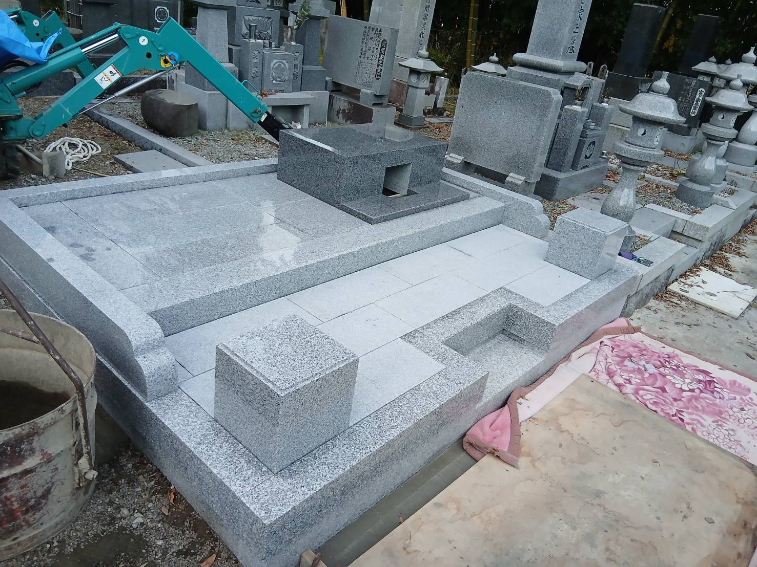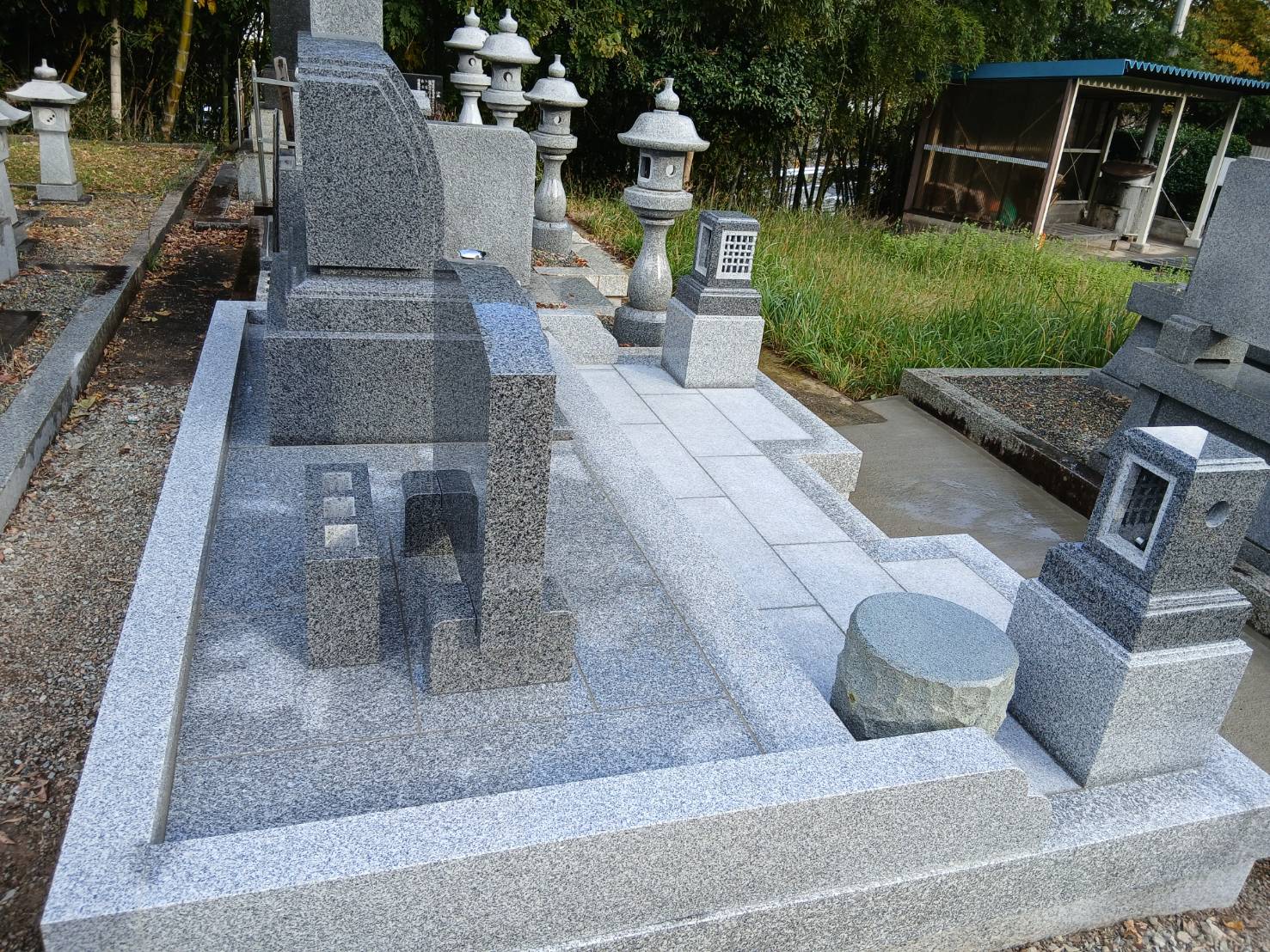 2026.04.04 豊岡市 H様 外国産グレー系御影石 デザイン墓 土留石・縁石・玉垣の据付、金具留めをしています石碑周りの上段および下段の土間は貼石施工で見た目も豪華です手前角にはデザイン型置き灯篭を据え全体をまとめています 墓地基礎工事ベースコンクリート打設土間貼石工事副碑裏に塔婆立据付 一覧へ戻る