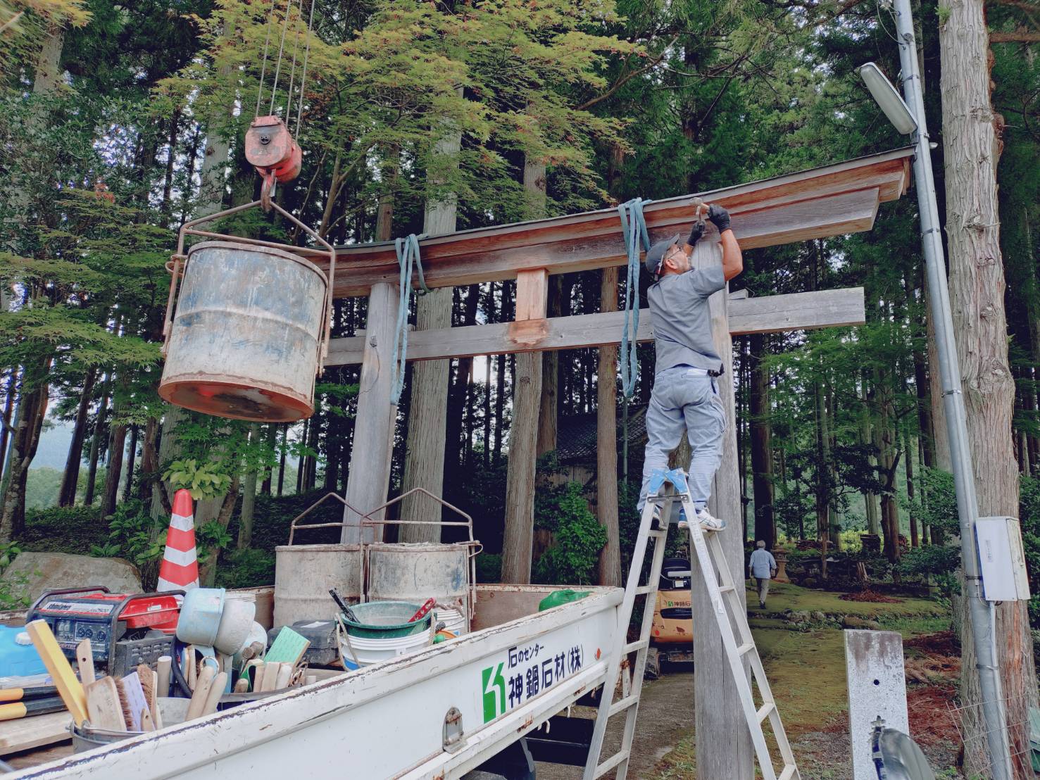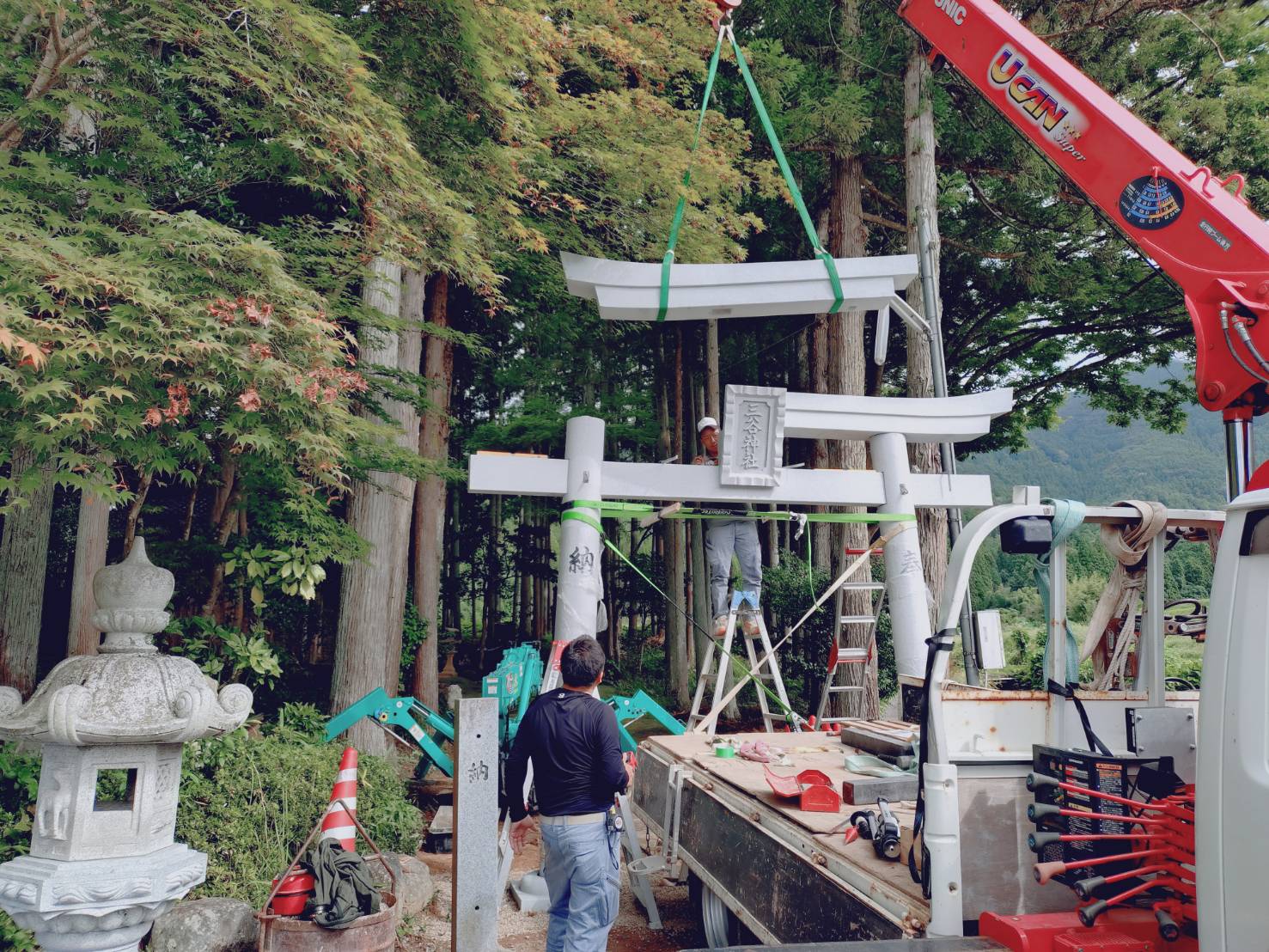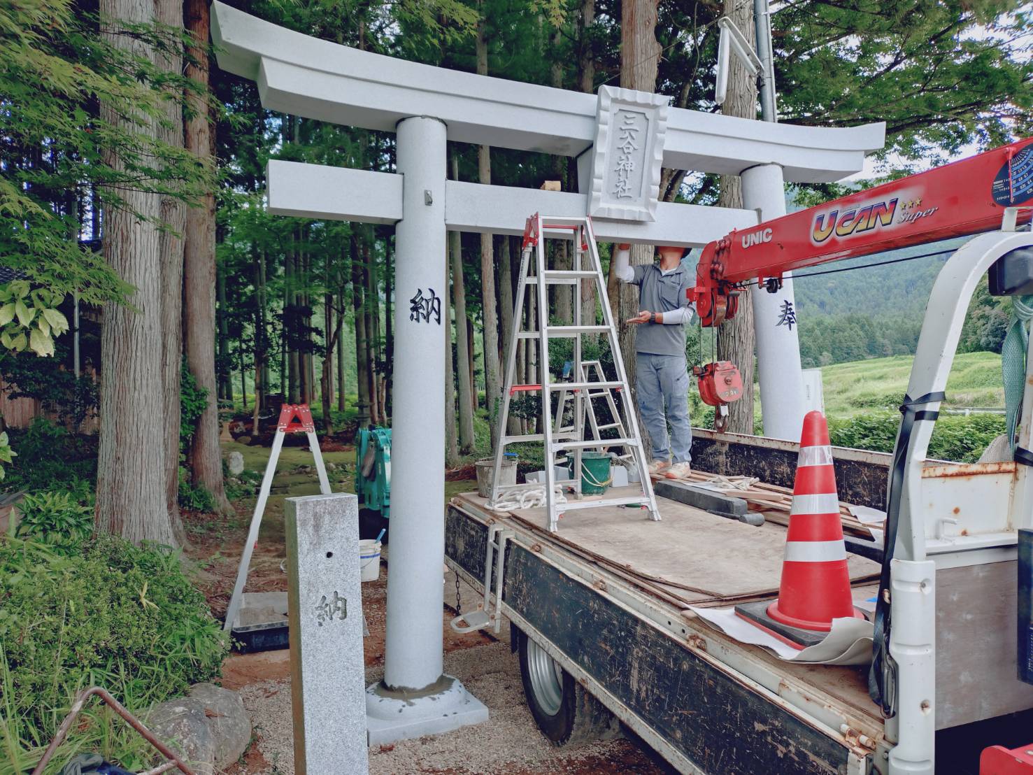 2026.01.27 朝来市 神社鳥居建立 朝来市の2つの区が隔年で管理される神社ですこの度、木製の鳥居から白御影石の鳥居への建て替えです10尺の鳥居の柱には、表に奉納 裏には建立年月を彫刻しています荘厳な雰囲気の素敵な神社です 木製鳥居を取り外しています基礎工事クレーンで吊り上げながら建てています仕上げに神社名を刻んだ額石を据え付けました 一覧へ戻る