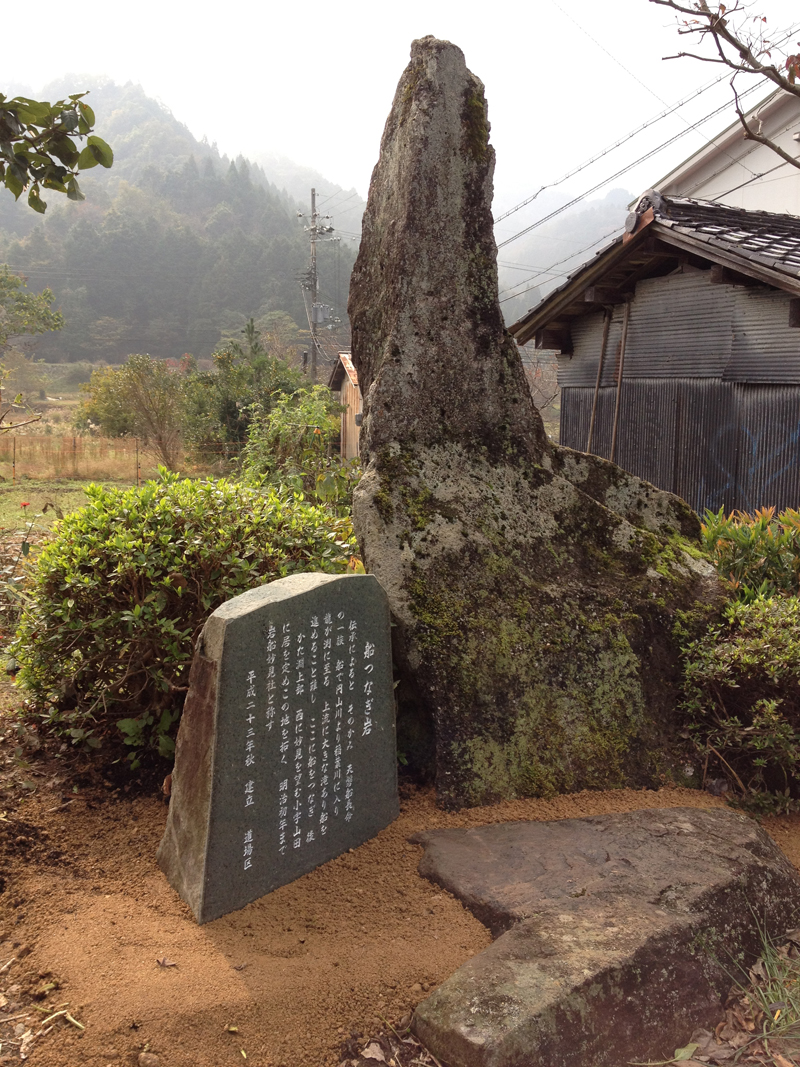 2012.03.09 船つなぎ岩 平成23年秋に日高町道場地区の船つなぎ岩の由緒書きを記した記念碑を作りました。この岩の先端に船をつないでおり、その由来が記されております。内容は以下の通りです。 「伝承によると そのかみ 天磐船長命の一族 船で円山川より稲葉川に入り 龍が渕に至る 上流に大きな滝あり船を進めること難し ここに船をつなぎ 後 かた淵上部 西に妙見を望む小字山田に居を定めこの地を拓く 明治初年まで岩船妙見社と称す」 一覧へ戻る